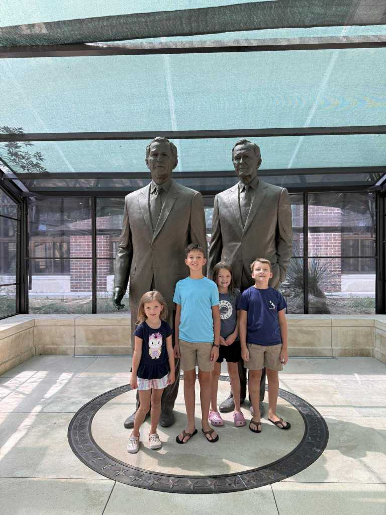 From there, we visited the George W. Bush Presidential Library. It was really moving, especially the exhibits on 9/11. Seeing the bullhorn Bush used at Ground Zero, a piece of the Twin Towers, and the memorial wall of names was powerful. The replica Oval Office was also pretty neat — though I’m not sure the kids cared as much as Josh did!